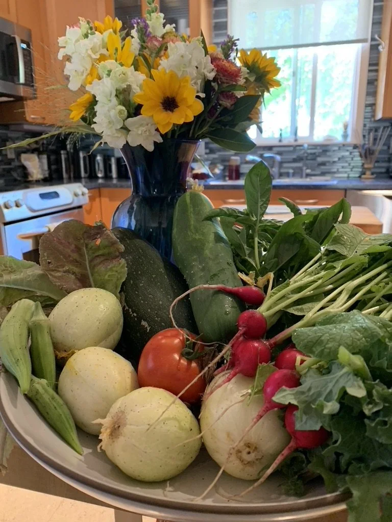 It's summer time and our garden is producing lots of yummy gifts. The Chinese Long Beans are not quite a yard long yet. We’ve been picking okra, cucumbers, basil, kale, zucchini and sun-gold tomatoes.